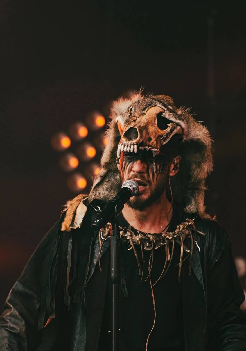 Многие музыканты и перформеры используют такие маски в своих выступлениях. Например, Денис Бривин из группы YARUGA создает запоминающиеся сценические образы, где меховые элементы играют важную роль, добавляя образу мистичности и силы. В данном образе используется маска-череп волка нашего производства. Музыкант добавил мех, что делает его образ поистине шаманским.
