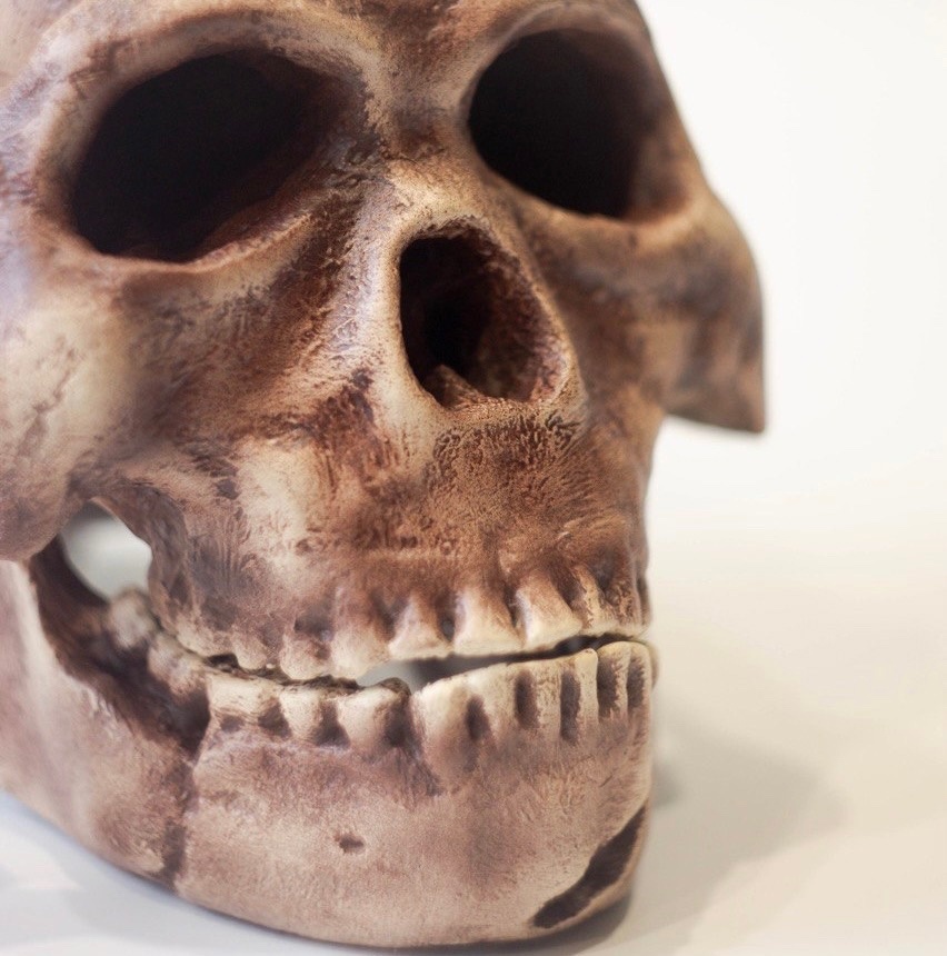 Черепа грунтуем по другой методике, хотя есть несколько черепов и масок, которые грунтуем линейно, например, маску Мориарти (так идут следы печати). Но в основном на черепах мы используем другой метод, который позволяет создать эффект пор. Для этого мы как бы простукиваем грунт кисточкой. Эта методика также хорошо позволяет скрыть полосы печати.