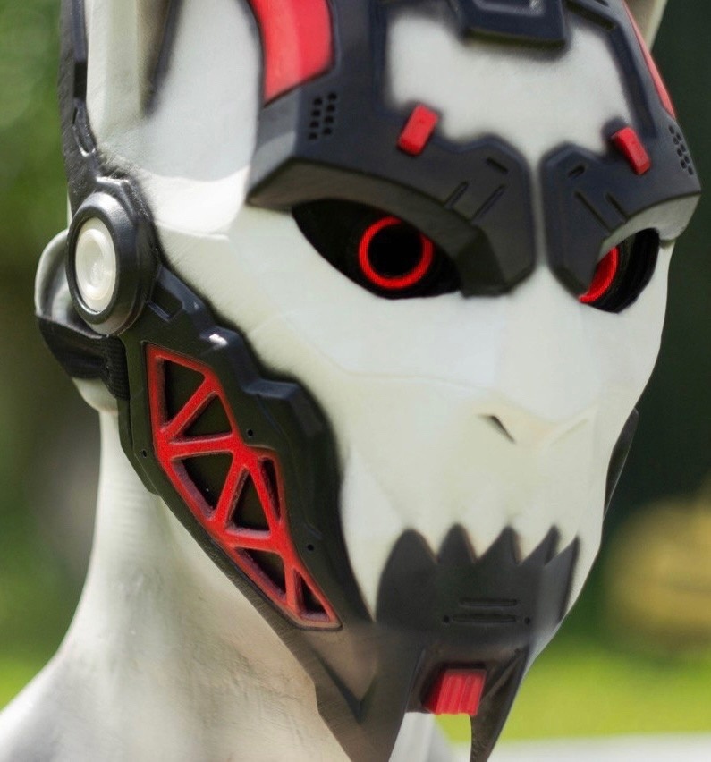 В некоторых масках нужно сделать так, чтобы вообще не было видно грунто — и это самое сложное. Дело в том, что после грунтования, приходится несколько раз действительно сильно пройтись наждачкой, смотреть, где остались ещё следы и ещё раз грунтовать, скрывать царапины и создавать максимально гладкую поверхность. Это, например, маска Киберкошки.